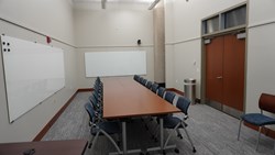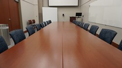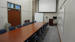 This room has a fully integrated audio/video system, which includes a Blu Ray player, phone conferencing, video streaming, laser projector, data collaboration, and Internet access.